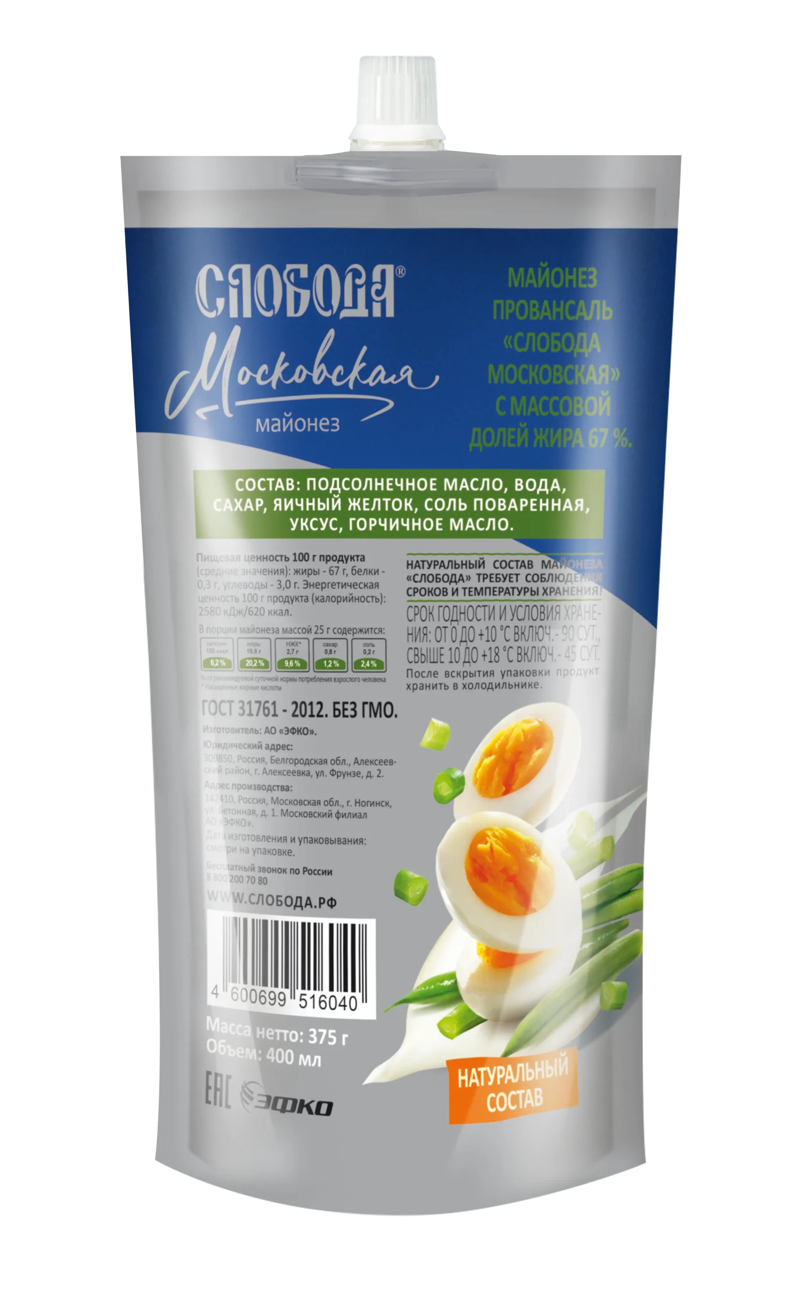 The traditional approach to the production of Provencal mayonnaise, the use of only natural ingredients, as well as modern and elegant design make Sloboda Moskovskaya mayonnaise especially appetizing