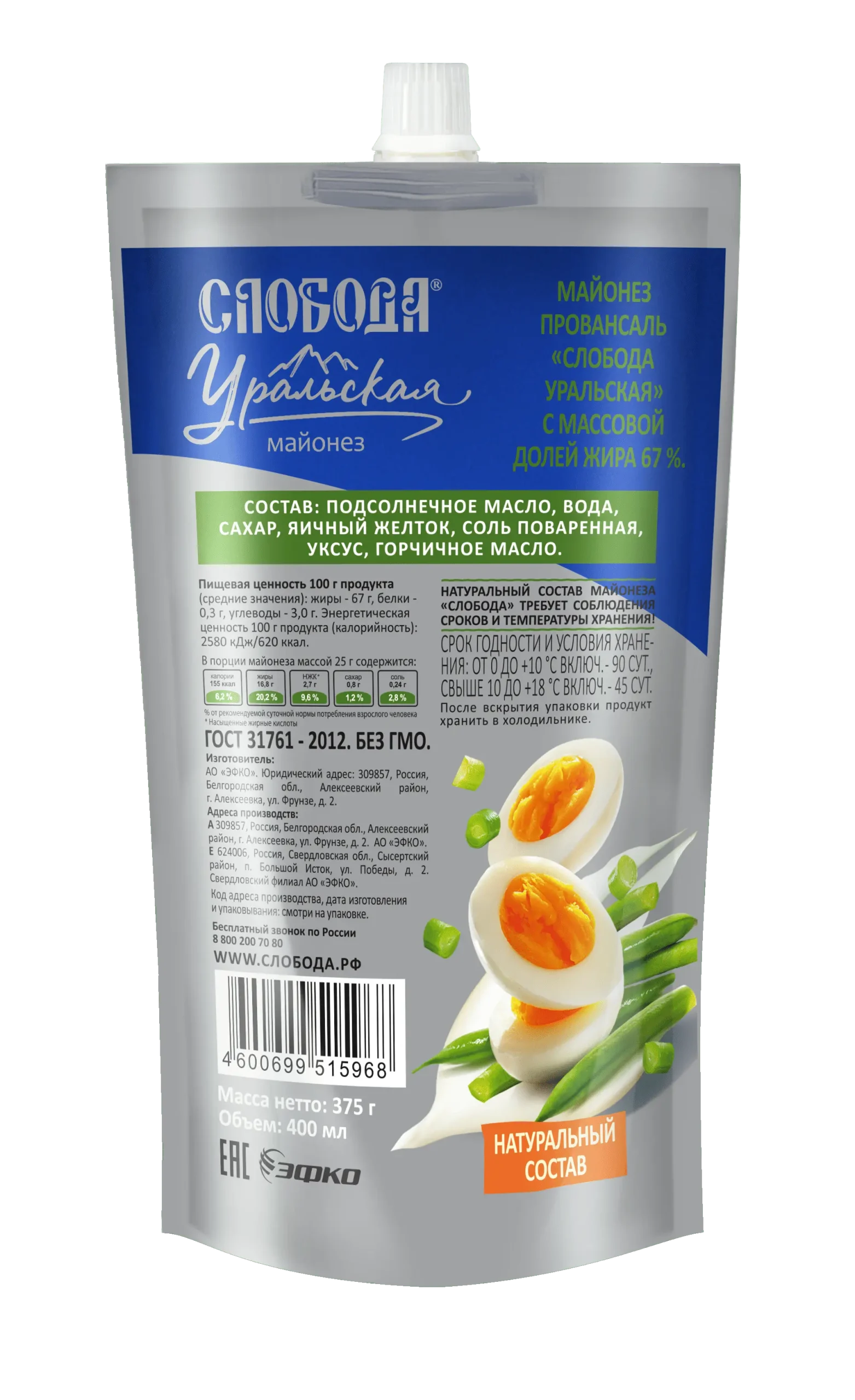The traditional approach to the production of Provencal mayonnaise, the use of only natural ingredients, as well as modern and elegant design make Sloboda Yralskaya mayonnaise especially appetizing